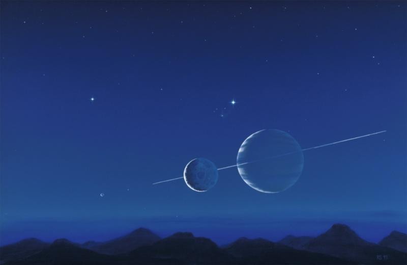 Dunkle Berge und ein Himmel mit einem Ringplaneten und seinen Monden.