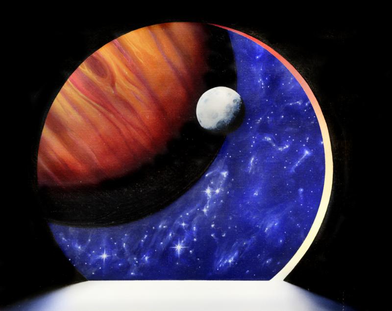 Blick durch das Bullauge eines Raumschiffes auf einen Gasplaneten mit einem Mond.