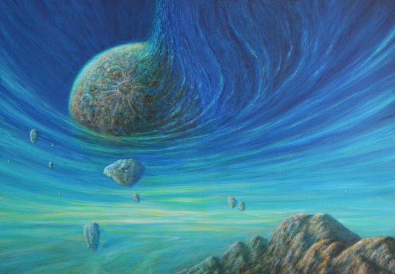 Mit einem kleinen Rundpinsel wurden Felsen, Wolkenbänder und der Planetoid mit entsprechenden Details versehen. Folgende Farben wurden von mir verwendet: