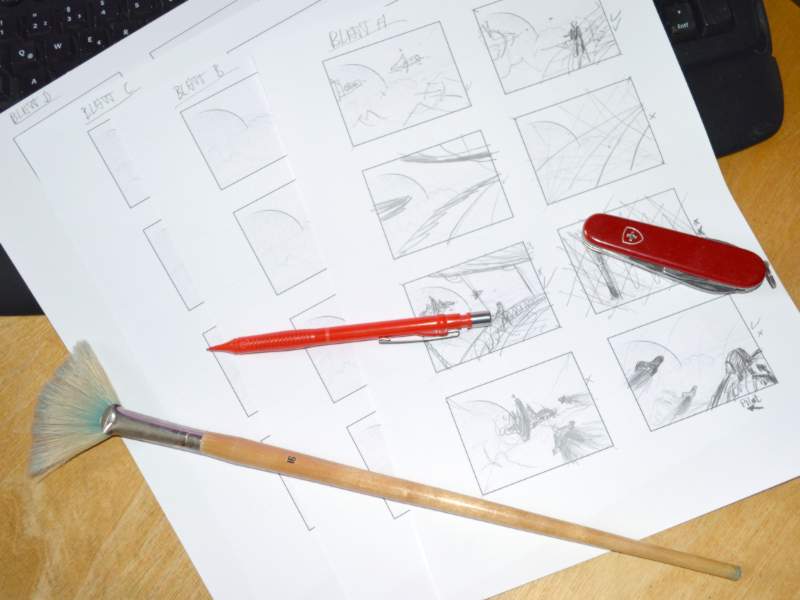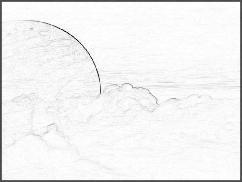 Da ich mit dem Entwurf 5 der Wolkenreise unzufrieden war, habe ich mich entschlossen das Motiv mit Bleistift und Papier weiter zu entwickeln. An der Wolkenlandschaft und dem Gasplaneten werde ich nichts mehr ändern!