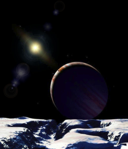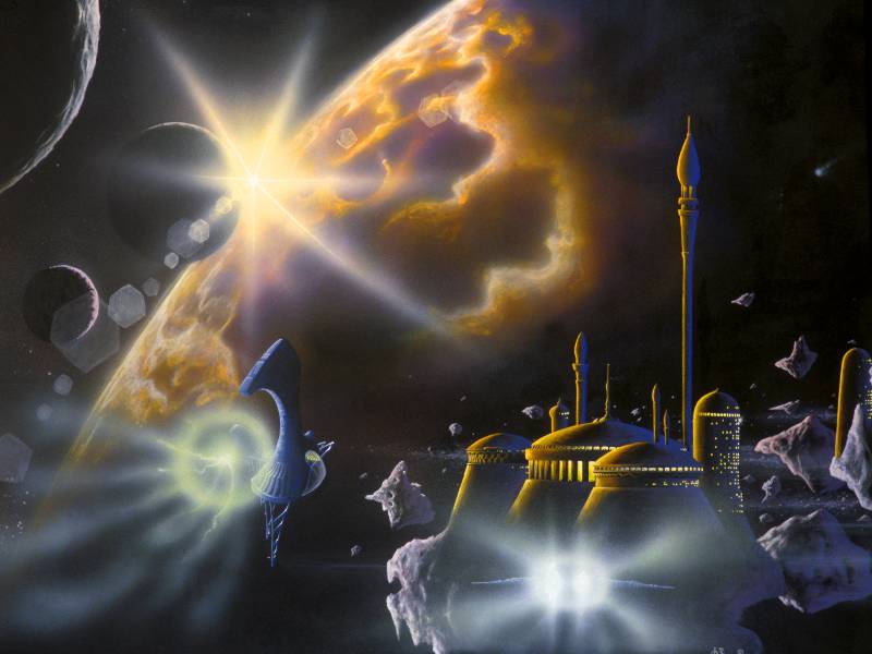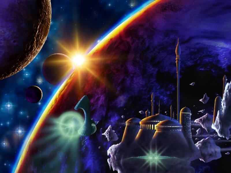 Die bunte Version des vorherigen Bildes. Der Himmel wurden gegen digital erzeugte Sterne und Welten ausgetauscht.