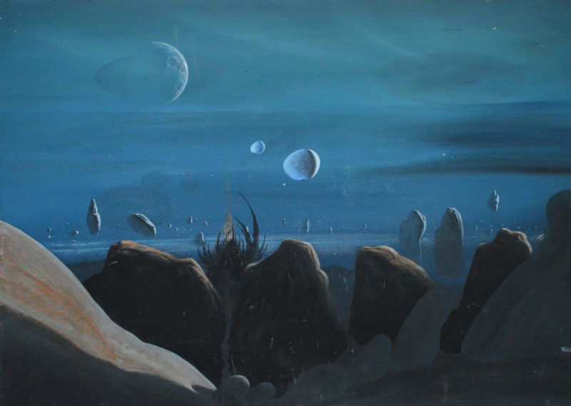 Im Jahr 1985 malte ich mit Acrylfarbe und Tusche dieses Bild. Dazu hatte ich mir eine kleine Geschichte ausgedacht, über ein einsames Tal, Menschen fressende Riesenspinnen, unbekannte schwebende Objekte, und einen Typen, der irgendwie in dieses Tal geraten war.
