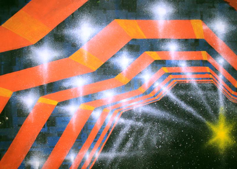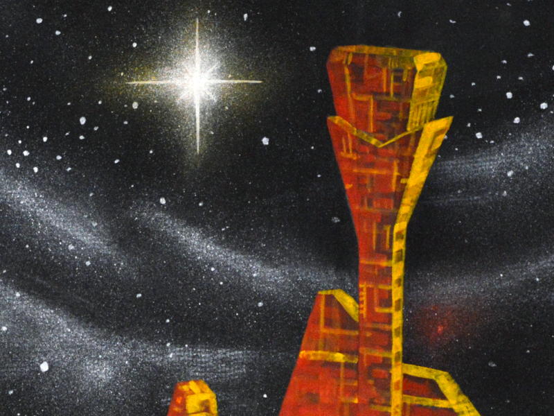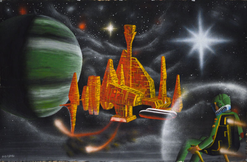 Ein seltsames Raumschiff fliegt durch den Weltraum. Eines meiner ersten Science-Fiction Motive. Ich habe dieses Bild mit Zahnbürste und Farbgitter gemalt. Kurz davor habe ich angefangen, Perry Rhodan zu lesen.