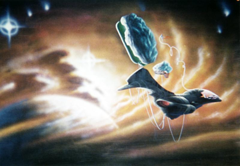 Eine Art Tankstelle im Weltall. Der Pilot hat sein Raumfahrzeug verlassen, um die Treibstoffleitungen mit der Tankstelle zu verbinden. Man beachte, wie die Leitungen in eine Richtung hängen. 🙁
