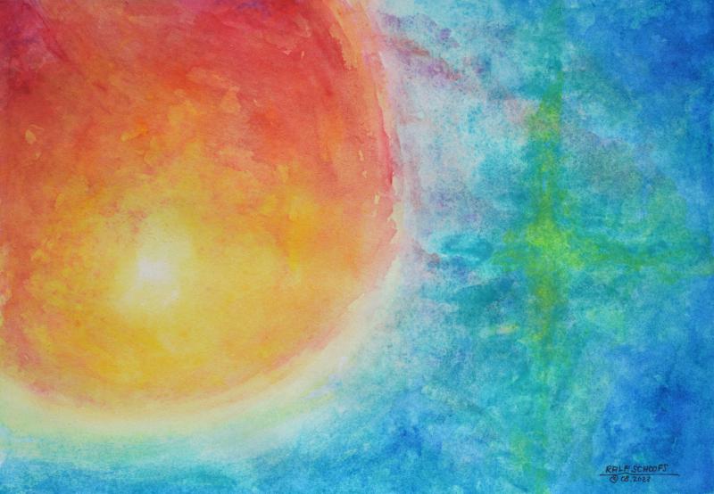 Im Foto fällt das Rot etwas zurück, im Original ist es nur etwas intensiver. Eine abstrakte Landschaft mit Aquarellfarbe von Daniel Smith gemalt.