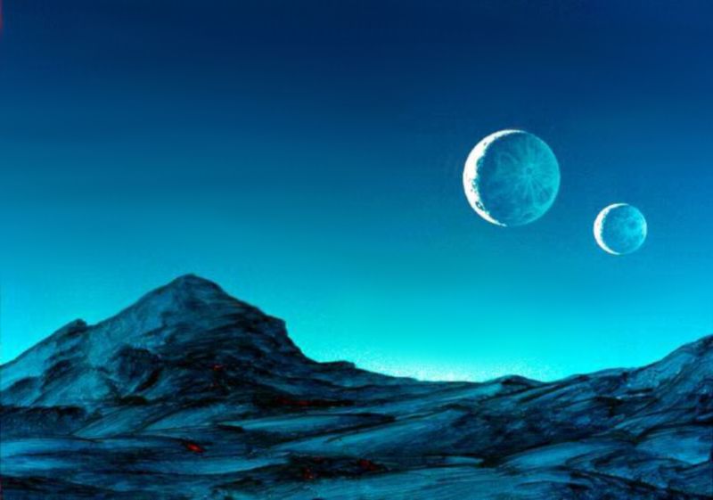 Eine düstere Landschaft in Blau und Schwarz. Am kalten Himmel stehen zwei helle Monde. Dieses Bild habe ich mit dem Motiv Kolonie übermalt. Das kann passieren.