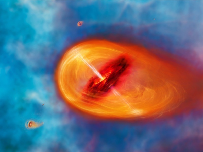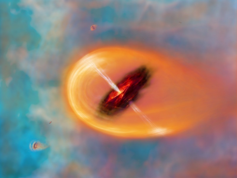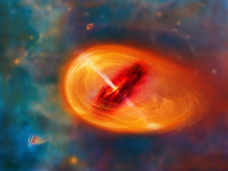 Surreale Darstellung eines frühen Sonnensystems. Stern und Planeten entstehen aus einer Nebelwolke aus Gas und Staub.