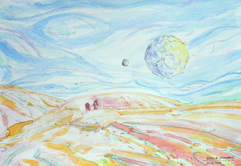 Ideenskizze eines neuen Bildes, ausgeführt auf Aquarellkarton von Arches. Die lockere Vorzeichnung habe ich mit Pigment Liner 308 von Staedtler angefertigt. Koloriert wurde mit Aquarellfarbe von Daniel Smith. Von diesem kostbaren Saft brauchte ich nicht viel.