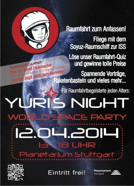 In einem Monat ist es wieder soweit: Yuri’s Night 2014 startet im Planetarium Stuttgart! Laut offizieller deutscher Webseite ist alles in trockenen Tüchern und das Programm steht. Viele Spaß und gutes Gelingen nach Stuttgart!