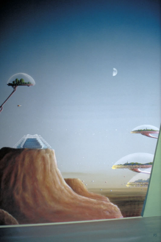 Die Athmosphäre der Erde ist verseucht, die Menschen leben in riesigen Kuppeln. Das Gebäude des Stuttgarter Planetarium ist auf einer Anhöhe zu sehen. Dies ist die erste Version des Motives „Treibhaus Erde“.