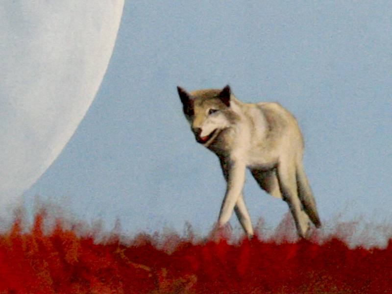 Ein Wolf streift einsam durch die rote Steppe. Ein Bild, das aus der Reihe fällt, da ich es speziell für eine Ausstellung gemalt habe.